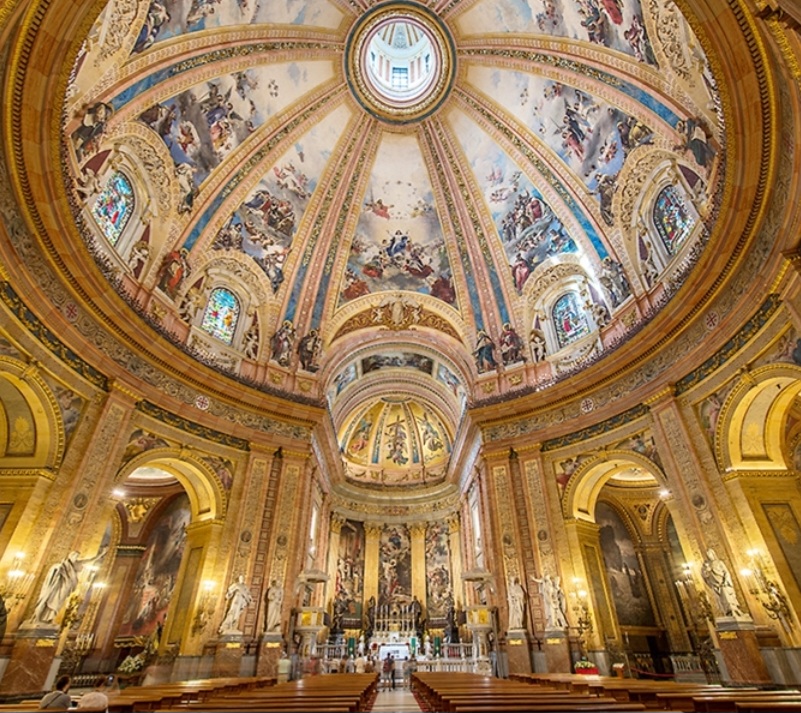 Camino de la catedral de la Almudena puedes aprovechar para conocer uno de los monumentos de Madrid mas desconocidos para los visitantes se trata de una iglesia con una cúpula considerada la tercera más grande de la cristiandad decorada toda con pinturas entre otros con pintores como Zurbaran o Goya.