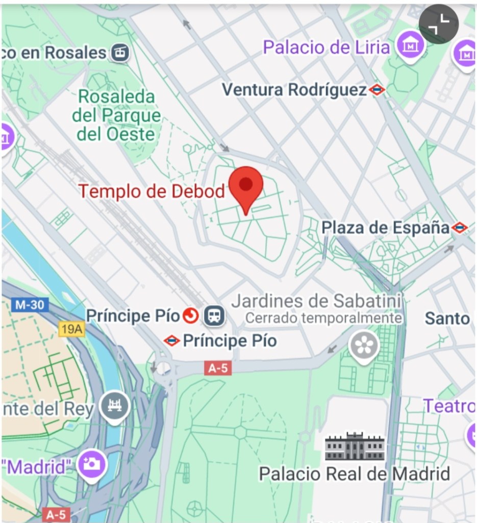 Un regalo de Egipto a Madrid por la colaboración en 1968 en el traslado de algunos templos para la construcción de la presa de Asuan en concreto el templo de abu símbel, el templo se encuentra situado de este a oeste como en su lugar de origen y es un pedazo de Egipto en Madrid un lugar además donde disfrutar de una bonita puesta de sol si te pilla en ese momento y sino puede aprovechar para acercarte al teleférico de Madrid donde podrás disfrutar de unas bonitas vistas de la ciudad en un trayecto en teleférico de 20 minutos.